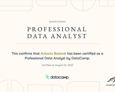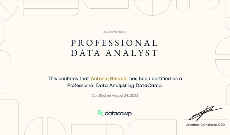 The Data Analysis Certification from DataCamp provides comprehensive training in extracting meaningful insights from data, equipping individuals with essential skills for effective data analysis. The program covers a wide range of topics, including data manipulation, statistical analysis, and data visualization, using popular tools and languages such as Python, R, SQL, pandas, NumPy, Matplotlib, and Seaborn. Through a combination of foundational courses and advanced topics, participants learn to clean and prepare data, perform exploratory data analysis, conduct statistical tests, and create impactful visualizations. Emphasizing practical, hands-on learning, the certification includes interactive exercises and real-world projects, ensuring that learners can apply theoretical concepts to actual data problems. By the end of the program, participants are well-prepared for roles such as Data Analyst and Business Analyst, capable of making data-driven decisions and effectively communicating their findings.