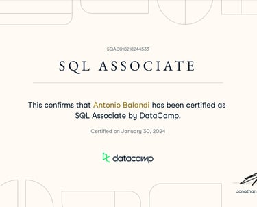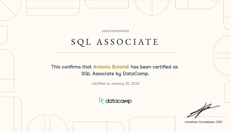 The SQL Certification from DataCamp equips individuals with essential skills for managing and querying relational databases, providing a strong foundation in SQL. The program covers a comprehensive range of topics, from basic querying to advanced data manipulation and performance optimization. Participants learn to write efficient SQL queries to retrieve, filter, and aggregate data, as well as to join tables, create subqueries, and perform complex data transformations. The curriculum also emphasizes best practices for database design, indexing, and normalization, ensuring that learners can handle large datasets effectively and maintain database integrity. With a focus on practical, hands-on learning, the certification includes interactive exercises and real-world projects that allow participants to apply their knowledge in realistic scenarios. By the end of the program, individuals are well-prepared to manage and analyze data in various roles such as Data Analyst, Database Administrator, and Business Analyst, leveraging SQL to drive data-driven decision-making and insights.
